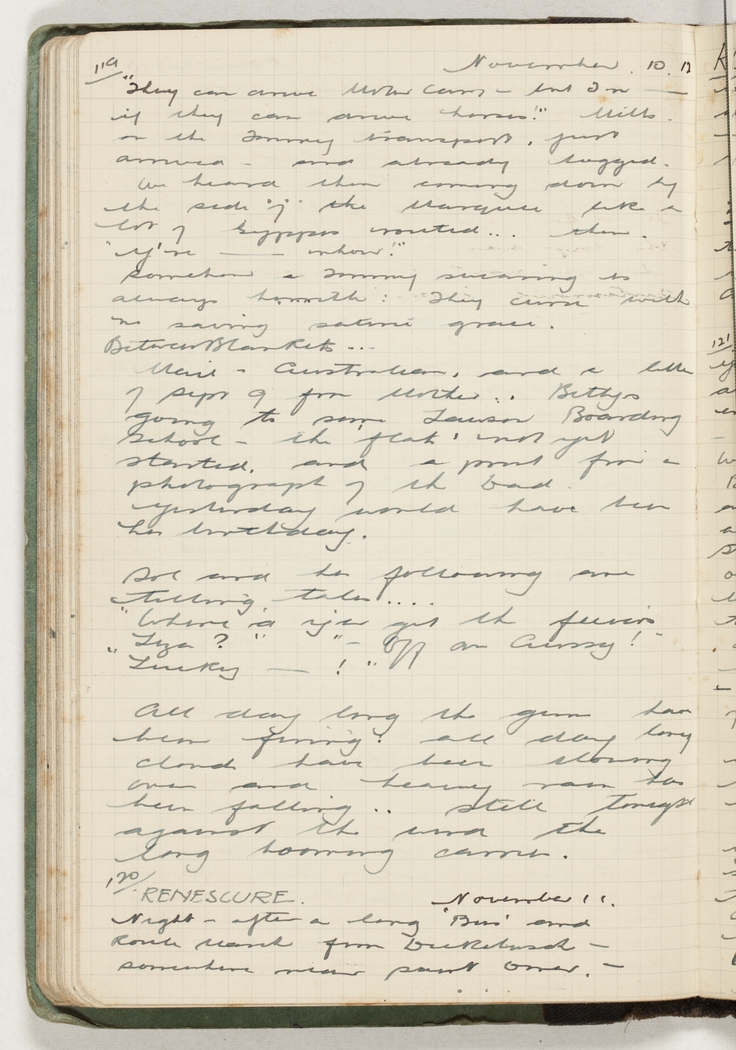 "They can drive Motor Cars – but I'm – if they can drive horses!", Mills on the Tommy transport, just arrived – and already buggered. We heard them coming down by the side of the Marquee like a lot of Gyppos routed.. then "Y're – nhow!" Somehow a Tommy swearing is always horrible: They curse with no saving satiric grace. Between Blankets…