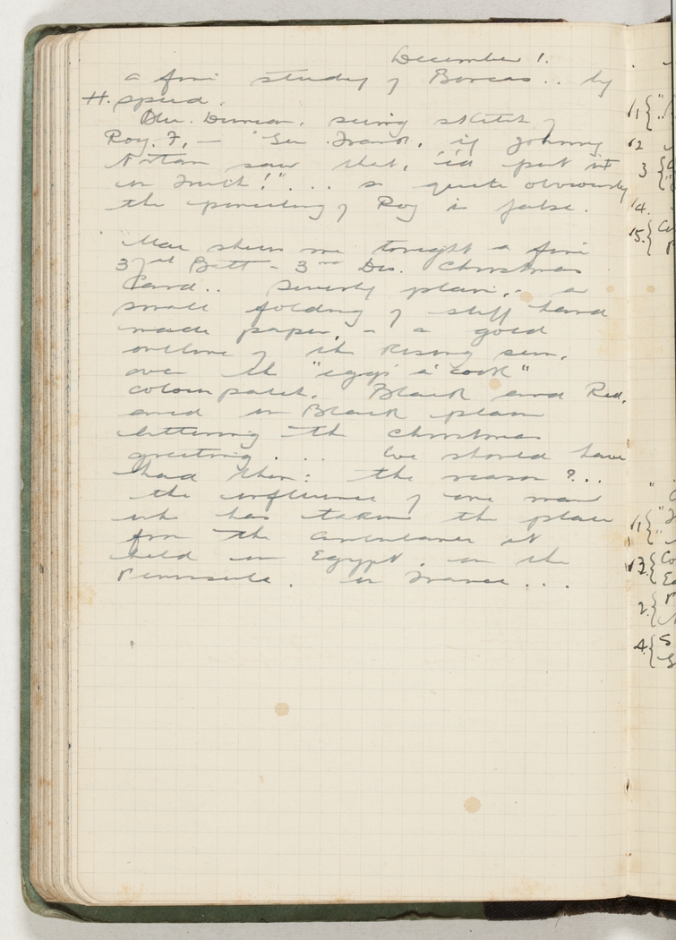 Mac shews me tonight a fine 37th Batt., 3rd Div. Christmas Card..severely plain.. a small folding of stiff hand made paper, a gold outline of the Rising Sun, over the "eggs a'cook" colour patch. Black and Red, and in Black plain lettering the Christmas greeting… We should have had them: the reason ?...the influence of one man who has taken the place from the Ambulance it held in Egypt, in the Peninsula, in France….