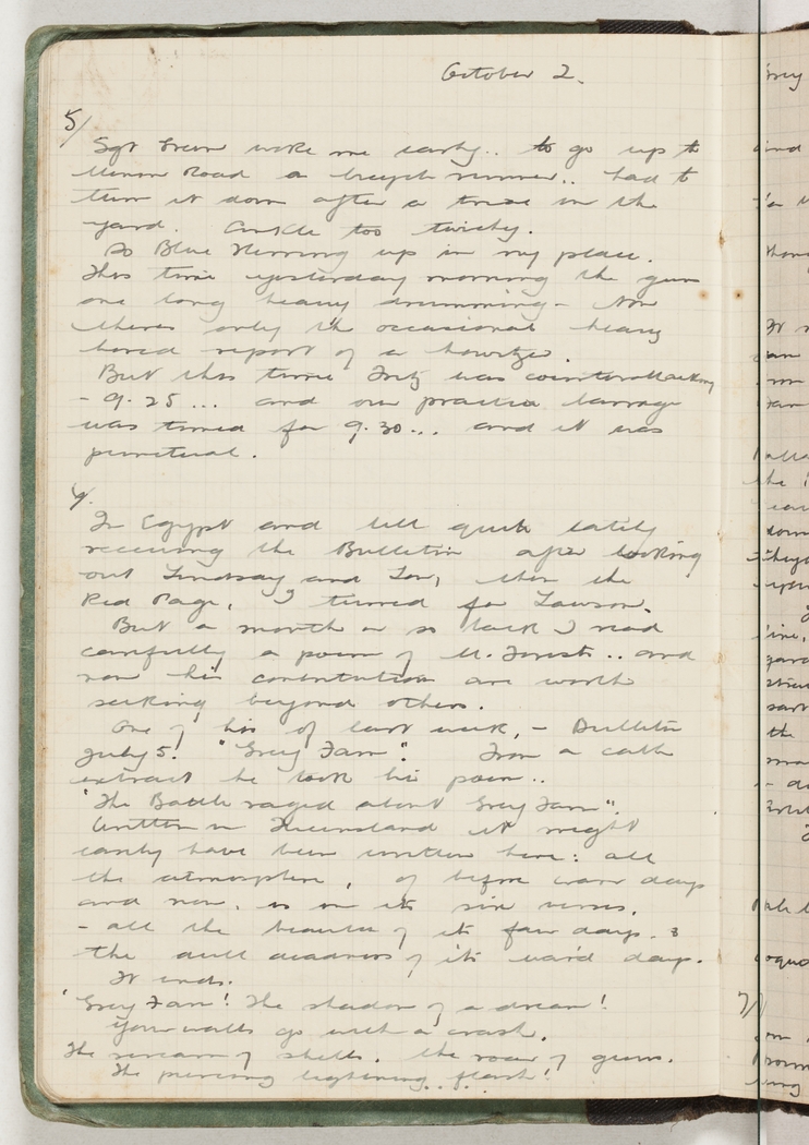 In Egypt and till quite lately receiving the Bulletin after looking out Lindsay and Low, then the Red Page, I turned for Lawson. But a month or so back I read carefully a poem of M. Forest's, and now his contributions are worth seeking beyond others. One of his of last week – Bulletin July 5, "Grey Farm". From a cable extract he took his poem, "The Battle raged about Grey Farm". Written in Queensland it might easily have been written here: all the atmosphere, of before war days and now, as in its six verses, all the beauties of its few days & the dull deadness of its war'd days. It ends,