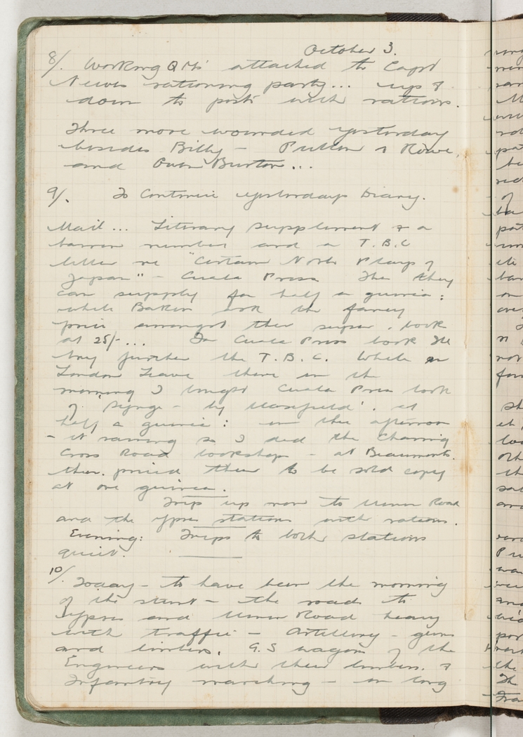 Word of more wounded today, Pullen, Rowe – Pullen was reported wounded a week ago, exaggeratedly and Owen Burton. just before we'd arrived at Menin Road post, Kinsett of the Transport knocked, one of his horses killed and other slightly wounded. The Transports 3rd casualty in France!