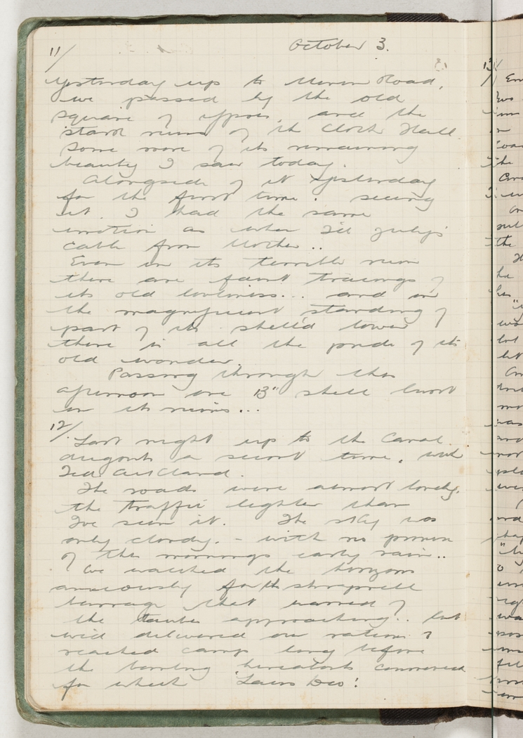 Yesterday up to Menin Road, we passed by the old square of Ypres, and the stark ruins of the Cloth Hall. Some more of its remaining beauty I saw today. Alongside of it yesterday for the first time, seeing it, I had the same emotion as when I'd July's cable from Mother. Even in its terrible ruin there are faint tracings of its old loveliness, and in the magnificent standing of part of its shell'd tower there is all the pride of its old wonder. Passing through this afternoon one 13" shell burst in its ruins.