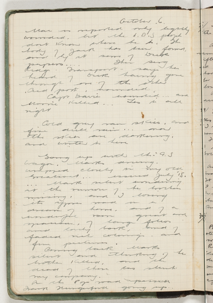 Going up with the G.S. Wagon, Marks driving, wrapped closely in my old Greatcoat, issued July '15, Marks silent wondering at the rumour of his brother missing, and I losing it, Ypres road, in a dream of home, and of a wonderful room great and spacious, of large folios and lovely books, and of faded rich colourings, and fine pictures.