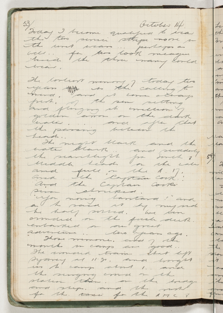The night black and the water black, and suddenly the searchlight from South & Middle heads on the water and full on the A.17, and the 'Captain Cook', and the Captain Cook's siren shrieked. "You noisy barstard!" and as he said it by my side he half sobbed. We were crowded on the first deck, embarked on our great adventure… two years ago. Those memories and of the months in camp are good. .. The crowded train that left Sydney at 11.30, and brought us to camp about 1, and the singing crowd on the station then, on the bridge and steps, and the rush for the taxi for the A.M.C. & Light Horse camps… and from the Measles, Mumps and V.D. Compounds too.