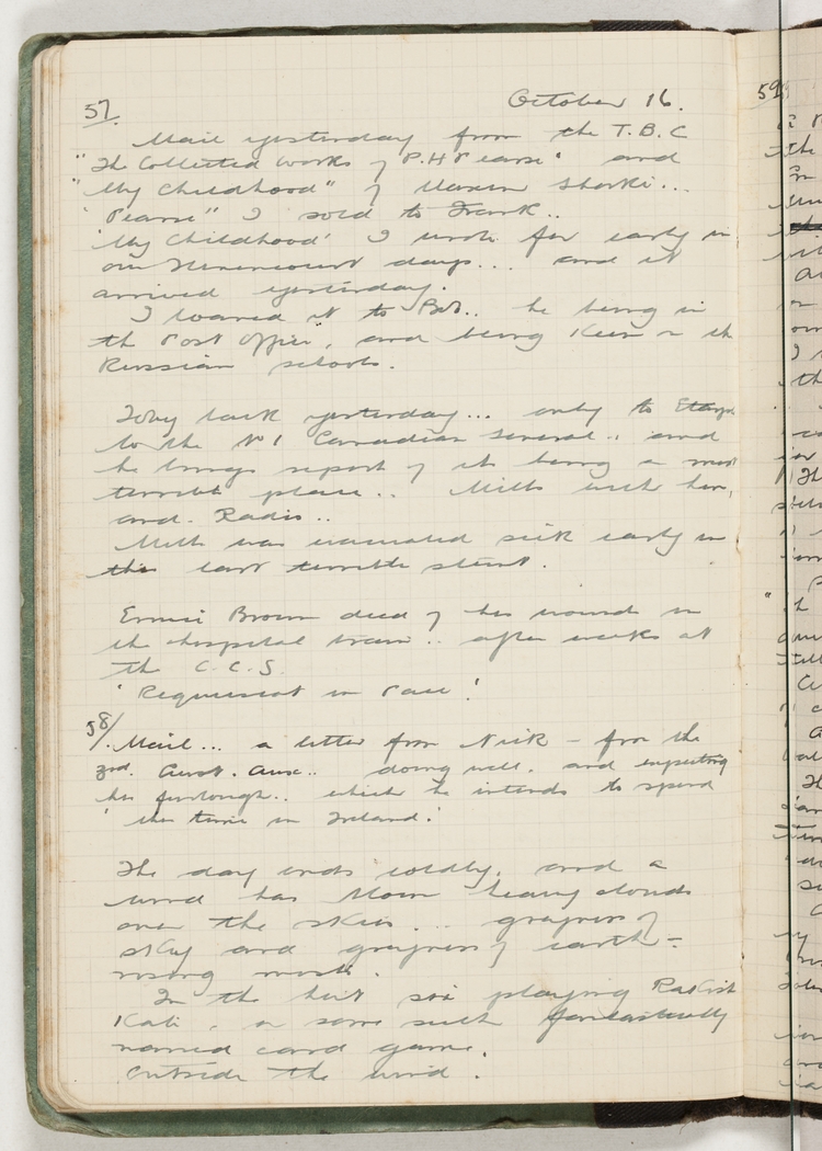 Toby back yesterday… only to Etaples to the No. 1 Canadian General, and he brings reports of its being a most terrible place, Mills with him, and Radis. Mills was evacuated sick early in this last terrible stunt.