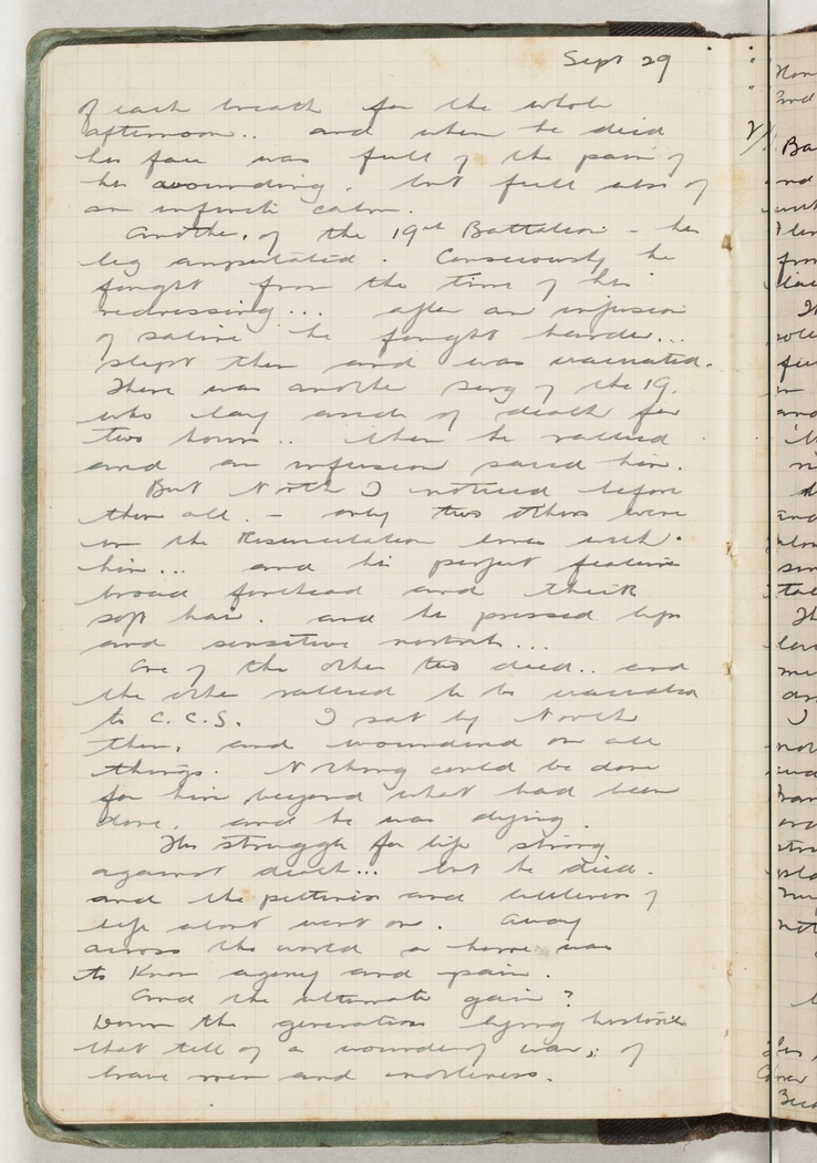 Another, of the 19th Battalion, his leg amputated. Consciously he fought from the time of his redressing…after an infusion of saline he fought harder, slept then and was evacuated. There was another Serg. of the 19th who lay aside of death for two hours, then he rallied and an infusion saved him.