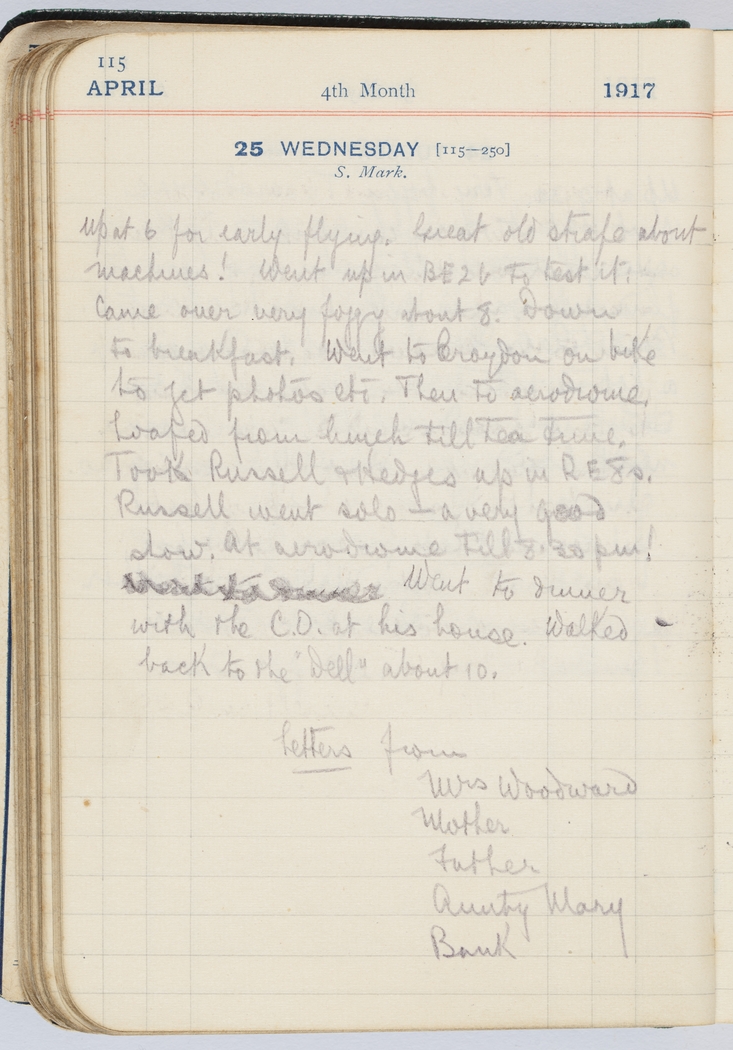 Up at 6 for early flying. Great old strafe about machines! Went up in BE2b to test it. Came over very foggy about 8. Down to breakfast. Went to Croydon on bike to get photos etc. Then to aerodrome. Loafed from lunch till tea time. Took Russell & Hedges up in RE8s. Russell went solo – a very good show. At aerodrome till 8.30 p.m.! Went to dinner with the C.O. at his house. Walked back to the "Dell" about 10.
