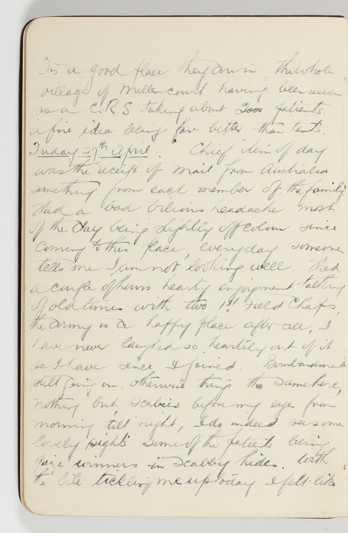 Chief item of day was the receipt of mail from Australia something from each member of the family. Had a bad bilious headache most of the day being slightly off colour since coming to this place, everyday someone tells me I am not looking well. Had a couple of hours hearty enjoyment talking of old times with two 1st. Field chaps, the army is a happy place after all, I have never laughed so heartily out of it as I have since I joined. Bombardment still going on, otherwise things the same here, nothing but scabies before my eyes from morning till night, I do indeed see some lovely sights some of the patients being prize winners in scabby hides. With the bile tickling me up today I felt like
