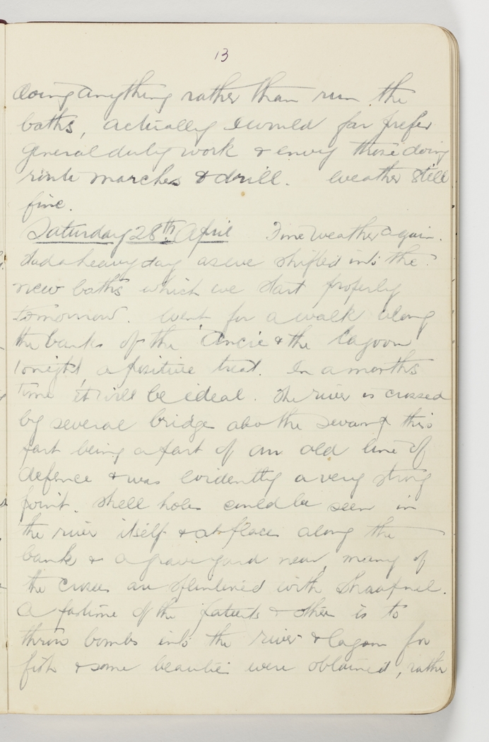 Fine weather again. Had a heavy day as we shifted into the new baths which we start properly tomorrow. Went for a walk along the banks of the "Ancre" & the lagoon tonight a positive treat. In a months time it will be ideal. The river is crossed by several bridges also the swamp this part being a part of an old line of defence & was evidently a very strong point, shell holes could be seen in the river itself & at places along the bank & a grave yard near, many of the crosses are splintered with the Shrapnel. A pastime of the patients & others is to throw bombs into the river & lagoon for fish & some beauties were obtained, rather