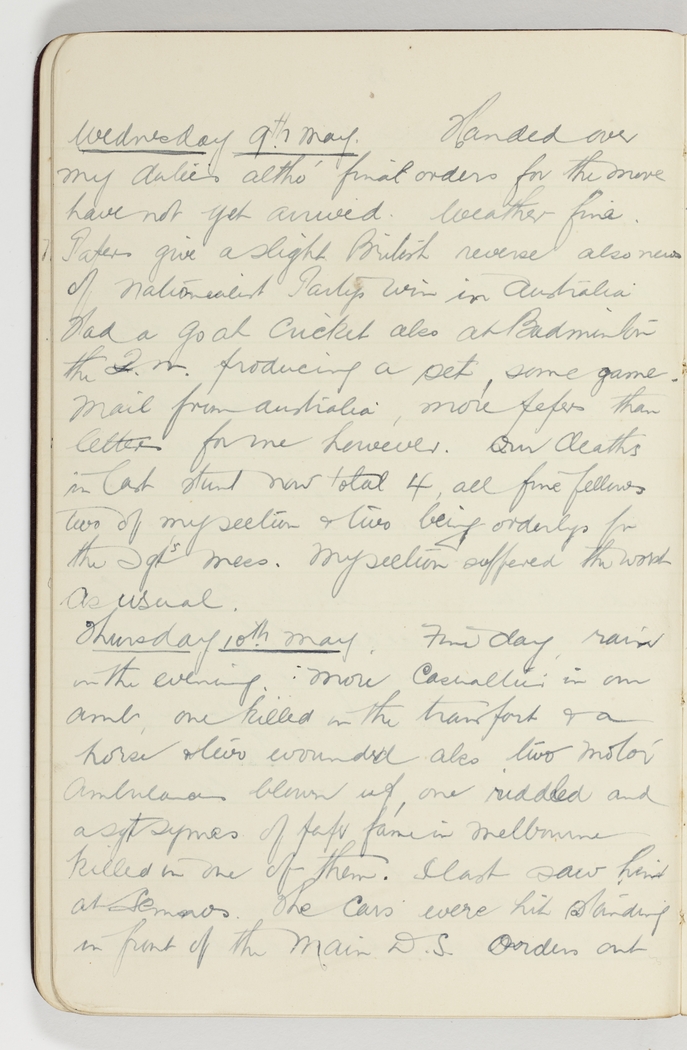 Handed over my duties altho' final orders for the move have not yet arrived. Weather fine. Papers give a slight British reverse also news of the Nationalist Party's win in Australia. Had a go at cricket also at Badminton the Q.M. producing a set, some game. Mail from Australia more papers than letters for me however. Our deaths in last stunt now total 4, all fine fellows two of my section & two being orderlys for the Sgt's mess. My section suffered the worst as usual.