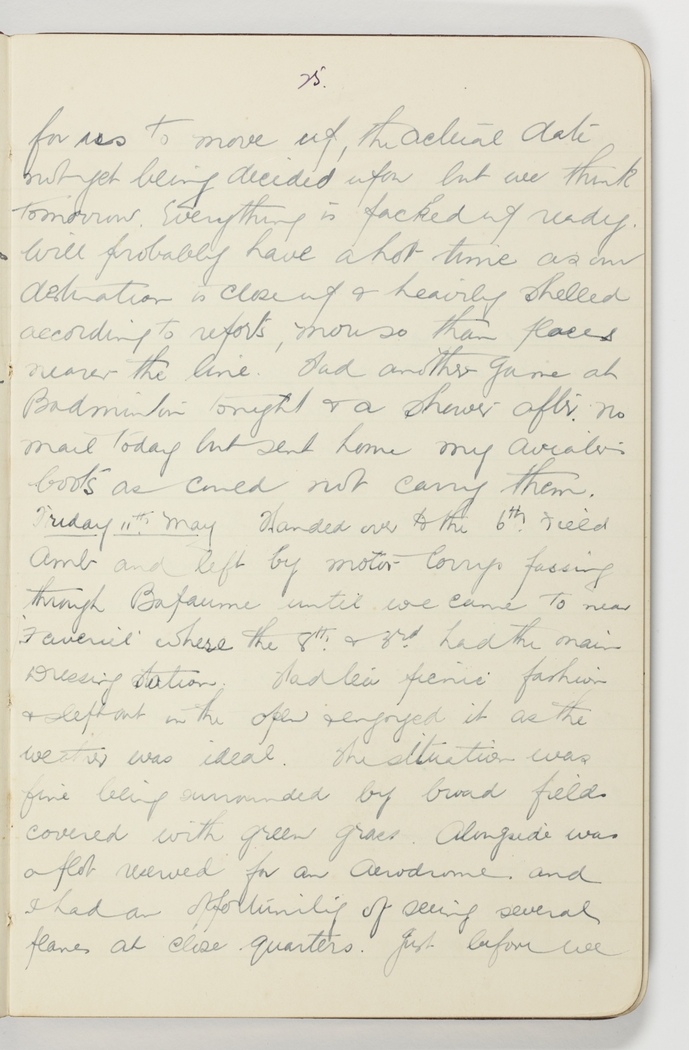 for us to move up, the actual date not yet being decided upon but we think tomorrow. Everything is packed up ready. Will probably have a hot time as our destination is close up & heavily shelled according to reports, more so than places nearer the line. Had another game at Badminton tonight & a shower after no mail today but sent home my aviators boots as could not carry them.