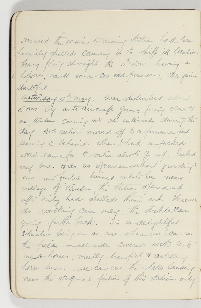 Was disturbed about 5 A.M. by anti aircraft guns firing close to us, taubes coming over at intervals during the day. A & B sections moved off to a forward post leaving C behind. When I had unpacked word came from C section also to go up. Packed my boxes to do so of course without growling! Our new position turned out to be near village of Vaulx, the station opened up after Fritz had shelled them out. There we do walking cases only, the stretcher cases going further back. 'Tis a delightful situation being on a rise where we can see the fields on all sides covered with tents men & horses, mostly transport & artillery horse lines. We can see the shells landing near the original position of this Station only