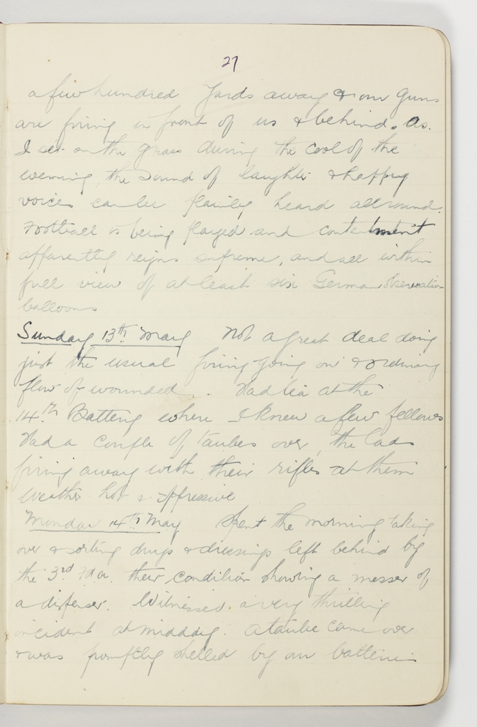 a few hundred yards away & our guns are firing in front of us & behind. As I sit on the grass during the cool of the evening the sound of laughter & happy voices can be plainly heard all round. Football is being played and contentment apparently reigns supreme, and all within full view of at least six German observation balloons.