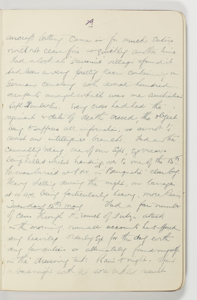 aircraft battery came in for much satire & will not cease fire so quickly another time. Had a look at "Favreuil" village & found it had been a pretty place containing a German cemetary with several hundred occupants amongst which was one Australian Capt. Pemberton. Every cross had had the regiment & date of death erased, the object being to suppress all information, so as not to assist our intelligence branch. Had another casualty today, one of our Sgts, Sgt Vicars being killed whilst handing over to one of the 15th. He was buried at 8 P.M. in "Beugnetie" close by. Heavy shelling during the night, our barrage at 4 A.M. being particularly heavy, more Rain.