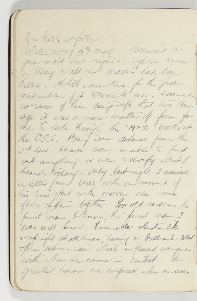 Received a good mail last night. A fellow came in today to tell me Morris had been killed. It took some time for the full realisation of it to come to me. I seemed so sure of him being safe that two days ago it was a mere matter of form for me to look through the A & D books at the C.C.S. Being some distance from the 2nd Div. I have been unable to find out anything or even to verify what I heard today. Only last night I received a letter from Will with an account of his time spent with Morris also some photos of them together. Poor old Morris, the finest man I ever will know. Honourable christianlike & upright at all times, having a brilliant intellect & firm determination which impressed everyone with whom he came in contact. The greatest honour ever conferred upon me was