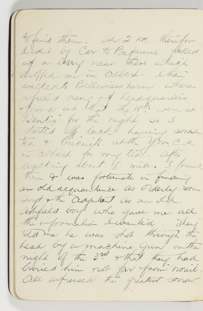 to find them. At 2 P.M. therefore I went by car to Bapaume picked up a lorry near there which dropped me in Albert. I then walked to Belleview Farm where a friend rang up headquarters & found out that the 18th. were at "Senlis" for the night so I started off back having some tea & biscuit at the Y.M.C.A. in Albert for my tea. After walking about 6 miles I found them & was fortunate in finding an old acquaintance as orderly room Sergt & the Adjutant as an old Ashfield boy who gave me all the information I wanted. They told me he was shot through the head by a machine gun on the night of the 3rd. & that they had buried him not too far from "Noreil." (Noreuil) All expressed the greatest sorrow