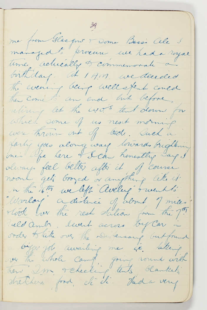 me from Glasgow & some Bass's Ale I managed to procure, we had a royal time actually to commemorate a birthday. At 1 A.M. we decided the evening being well spent could then come to an end but before retiring let the W.O's tent down for which some of us next morning were thrown out of bed. Such a party goes a long way towards brightening one's life here & I can honestly say I always feel better after it, of course noone gets boozed or anything like it. On the 16th we left "Aveluy" & went to "Warloy" a distance of about 7 miles & took over the rest station from the 7th Field Amb. I went across by car in order to take over the Dispensary but found a bigger job awaiting me i.e. taking over the whole camp, going round with their Q.M. & checking tents, blankets, stretchers, food, etc etc. Had a very