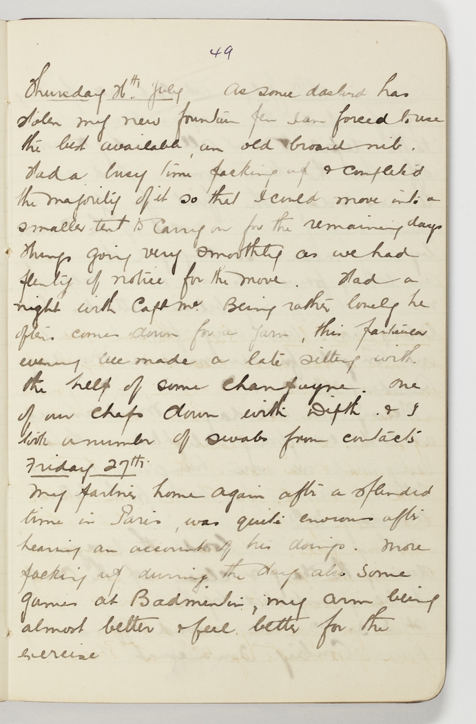 My partner home again after a splendid time in Paris, was quite envious after hearing an account of his doings. More packing up during the day also some games at Badminton, my arm being almost better for the exercise.