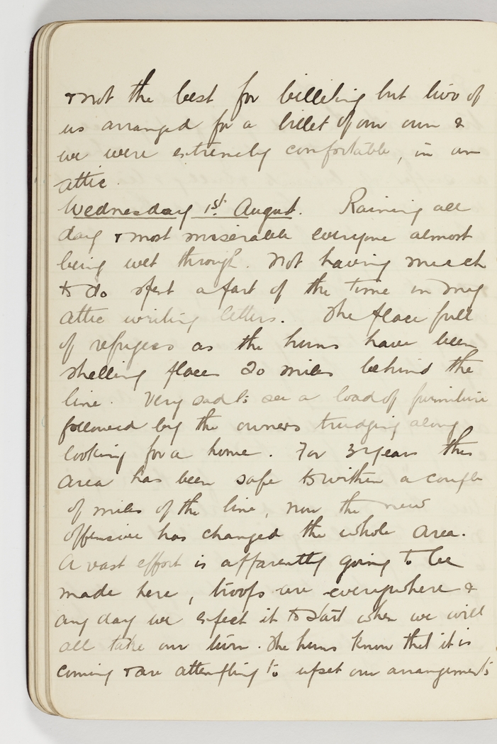 Raining all day & most miserable everyone almost being wet through. Not having much to do spent a part of the time in my attic writing letters. The place full of refugees as the huns have been shelling places 20 miles behind the line. Very sad to see a load of furniture followed by the owners trudging along looking for a home. For 3 years this area has been safe to within a couple of miles of the line, now the new offensive has changed the whole area. A vast effort is apparently going to be made here, troops are everywhere & any day we expect it to start when we will all take our turn. The huns know that it is coming & are attempting to upset our arrangements