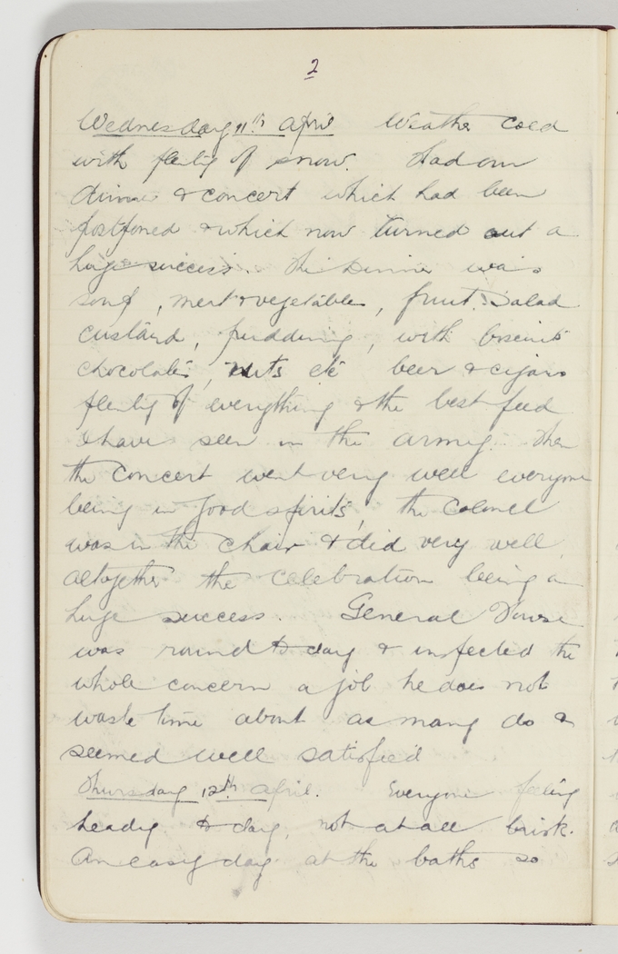 Weather cold with plenty of snow. Had our dinner & concert which had been postponed & which now turned out a huge success. The Dinner was soup, meat & vegetables, fruit salad custard, pudding, with biscuits chocolates, nuts etc beer & cigars plenty of everything & the best feed I have seen in the army. Then the concert went very well everyone being in good spirits, the Colonel was in the chair & did very well, altogether the celebration being a huge success. General Howse was round today & inspected the whole concern a job he does not waste time about as many do & seemed well satisfied
