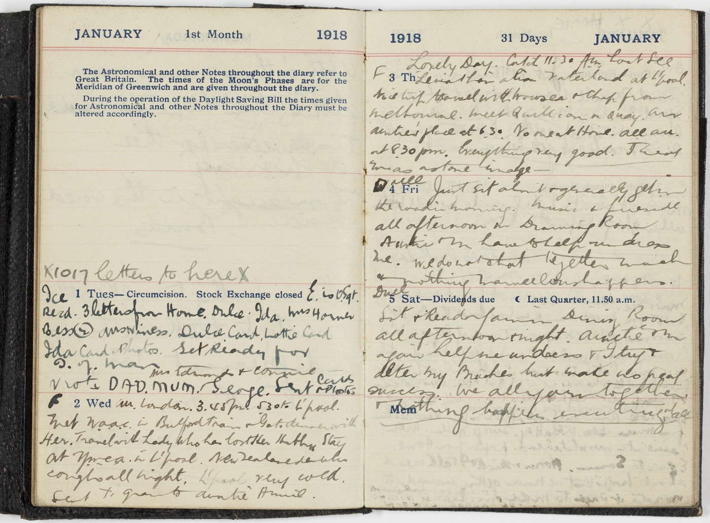 Lovely day. Catch 11.30 am boat See Leviathon also Faterland at L'pool. Nice trip travel with horses & chap from Melbourne. Meet Qarllion on quay. Arr Aunties' place at 6.30. No one at home. All arr 8.30 pm. Everything very good. I [indecipherable] as a stone image - [indecipherable]