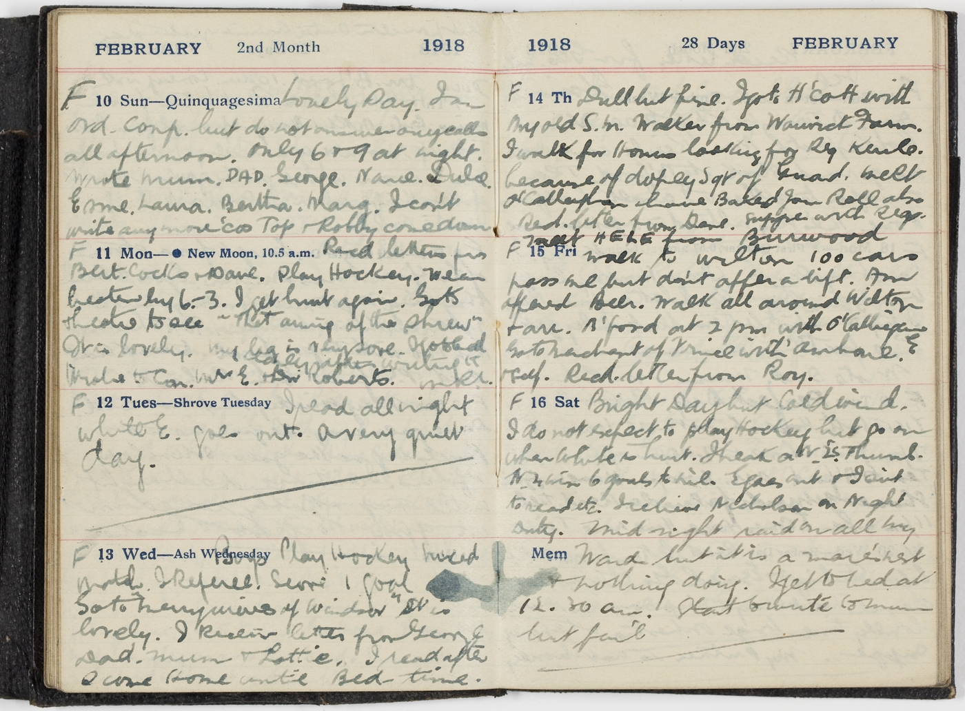Boys play hockey mixed match. I Referee Score 1 goal. Go to merry wives of Windsor It is lovely. I receive letters from George. Dad. Mum & Lottie. I read after I come home until bed-time.