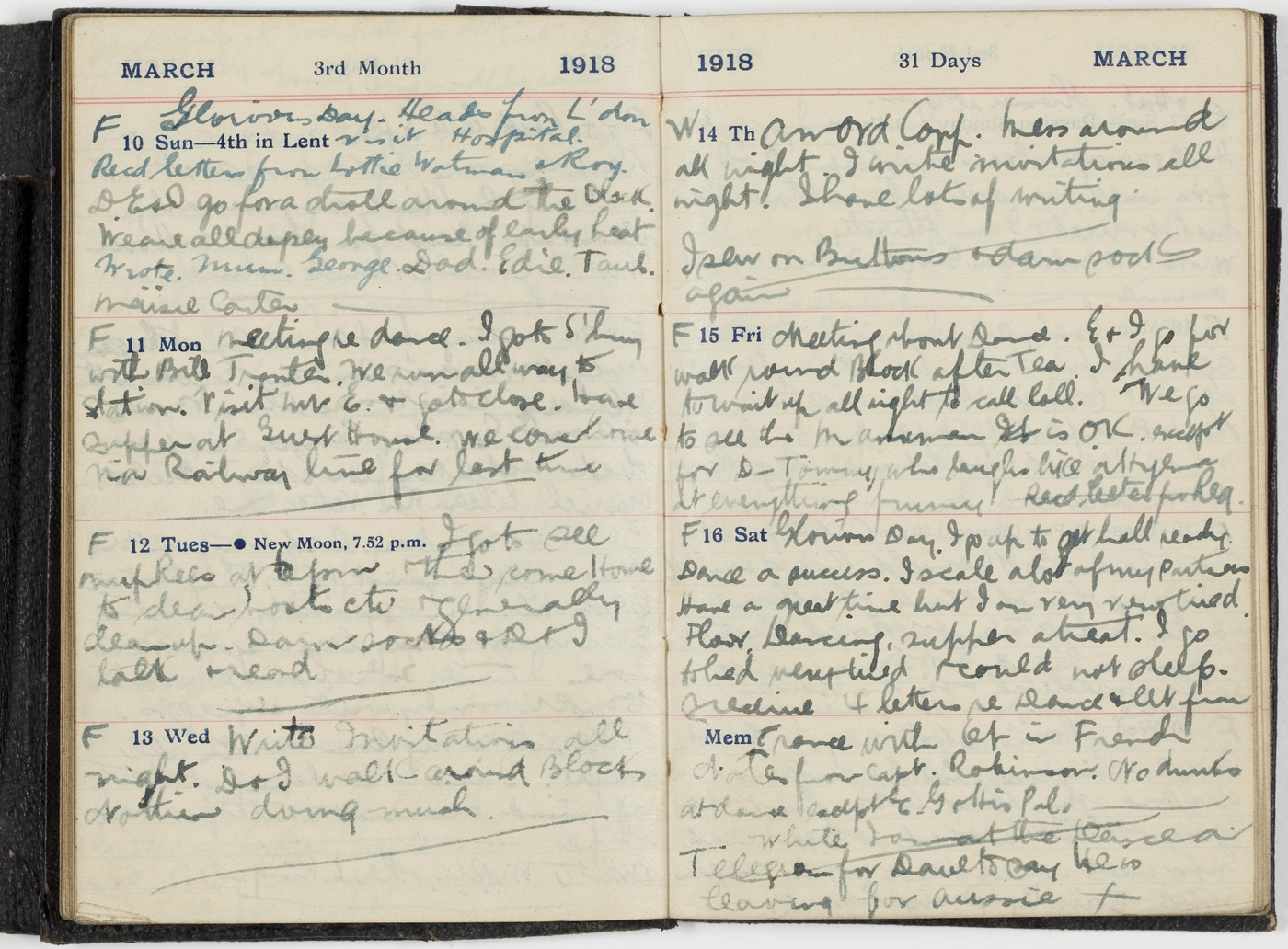 Glorious Day. I go up to get hall ready. Dance a success. I scale a lot of my parties. Have a great time but I am very tired. Plan Dancing, supper a treat. I go to bed very tired & could not sleep. Receive 4 letters re Dance & let from France with [indecipherable] in French dates from Capt. Robinson. No drinks at dance except E, G & his pal.