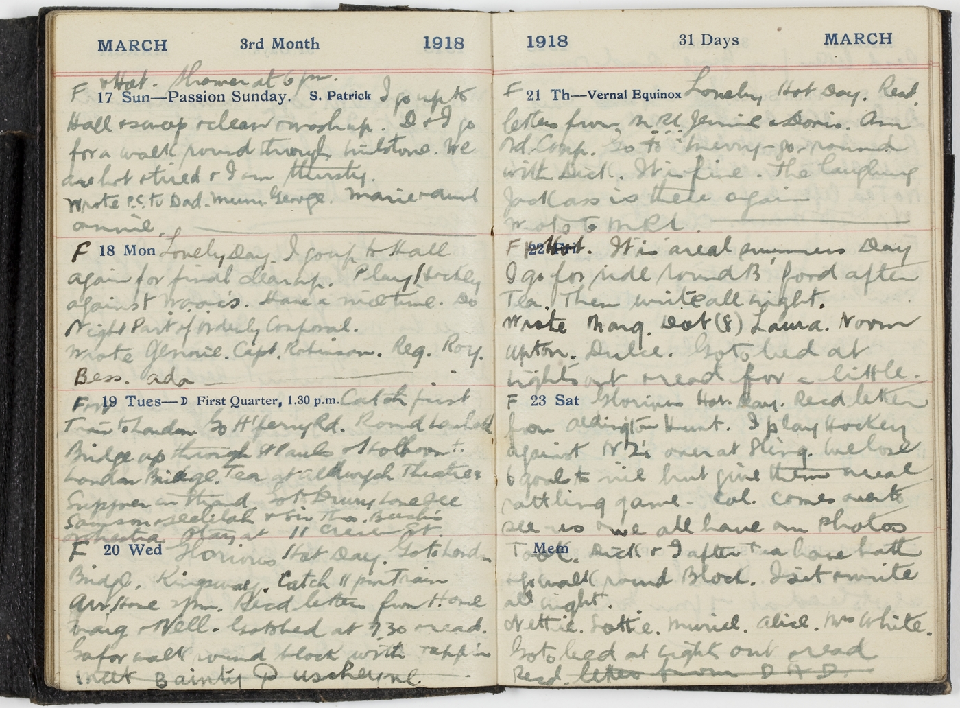 Glorious Hot Day. Go to London Bridge, Kingsway. Catch 11pm Train arr home 2pm. Recd. Letters from Home Marg & Nell. Go to bed at 7.30 & read.