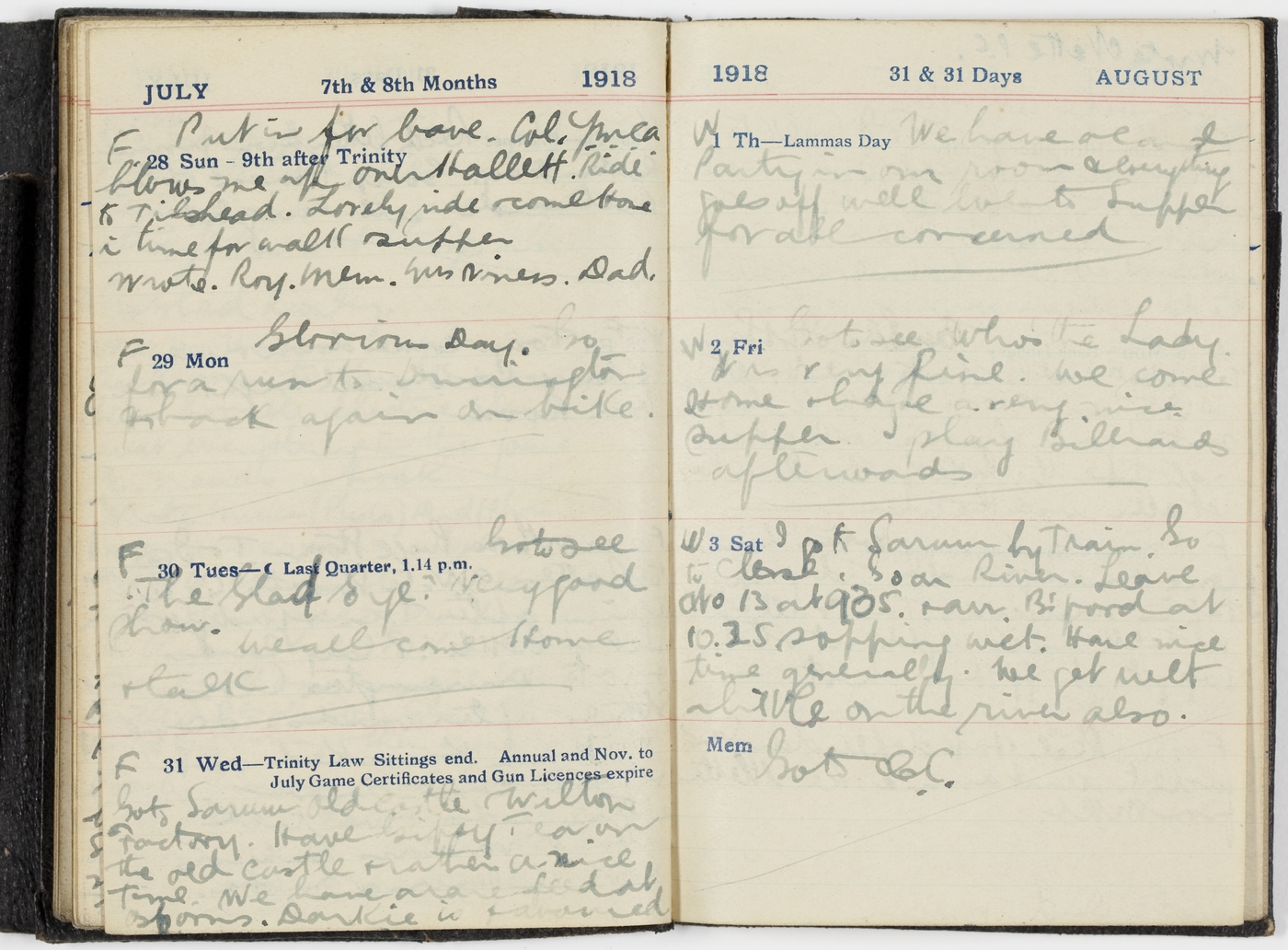 I go to Sarum by Train. Go to [indecipherable] Go on River. Leave at 20.13 at 9.05. & arr B'ford at 10.25 sopping wet. Have nice time generally. We get wet a little on the river also.