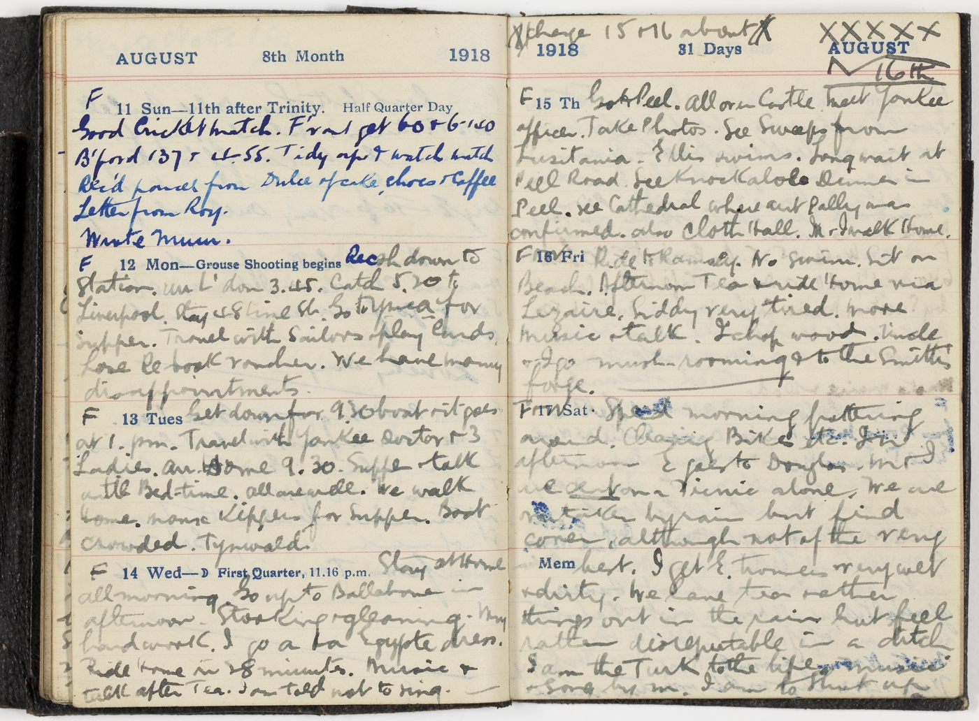 Ride to Ramsey. No swim. Sit on beach. Afternoon Tea & ride Home via Lezaire [Lezayre]. Giddy very tired. More music & talk. I chop wood. Uncle & I go mushrooming & to the Smith's forge. Charge 15 M6 about
