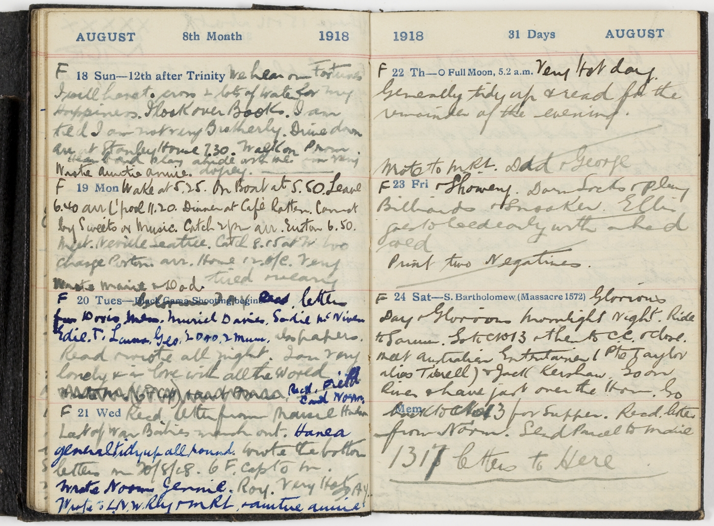 Recd letter from Maisie Halm. Last of War Babies march out. Have a general tidy up all round. Wrote the bottom letters on 20/8/18. 6 F. Cap to in. Wrote Norm. Jennie. Roy. Very Hot Day. Wrote to LN.W.Rly & MRL & Auntie Annie.