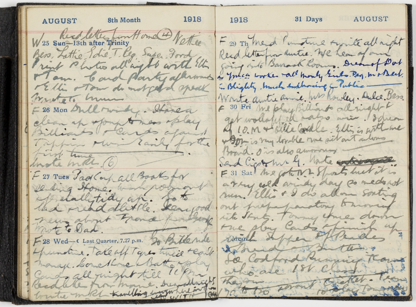 Go Bike ride & puncture. Take off tyres twice & can't manage. Come Home & Bath & play Cards all night till 11pm. Recd letter from Marie. Dream all night travelling everywhere in train. [indecipherable]