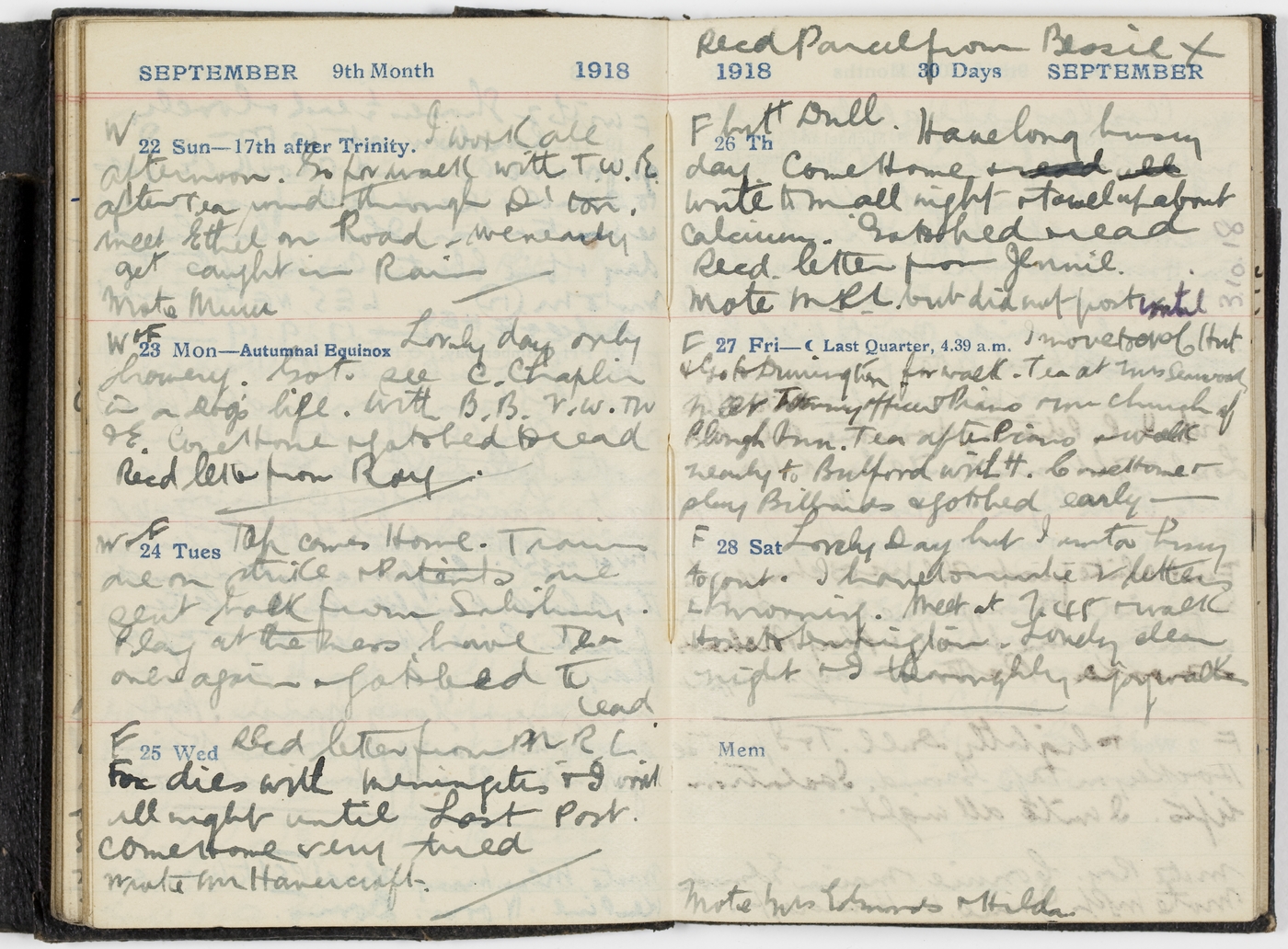 Lovely day only showery. Go to see C. Chaplin a Dog's life. With B.B. V.W. TW & E. Come home & go to bed to read.