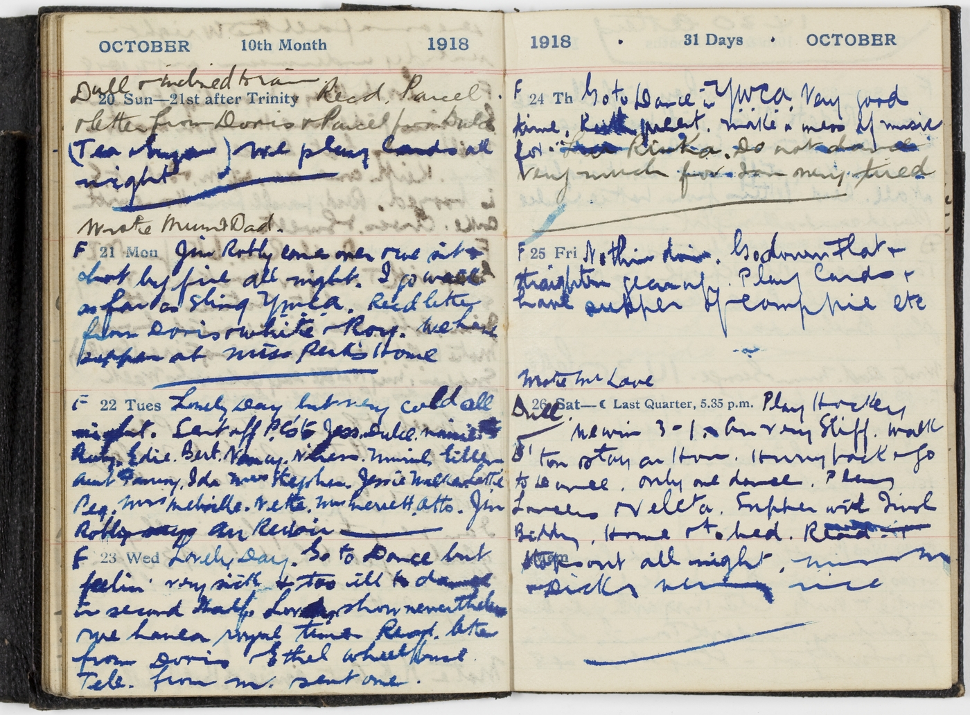 Go to Dance in Y.W.C.A. Very good time Ruth [Preent?]. Make a mess of music for [indecipherable]. Do not dance very much for I'm very tired