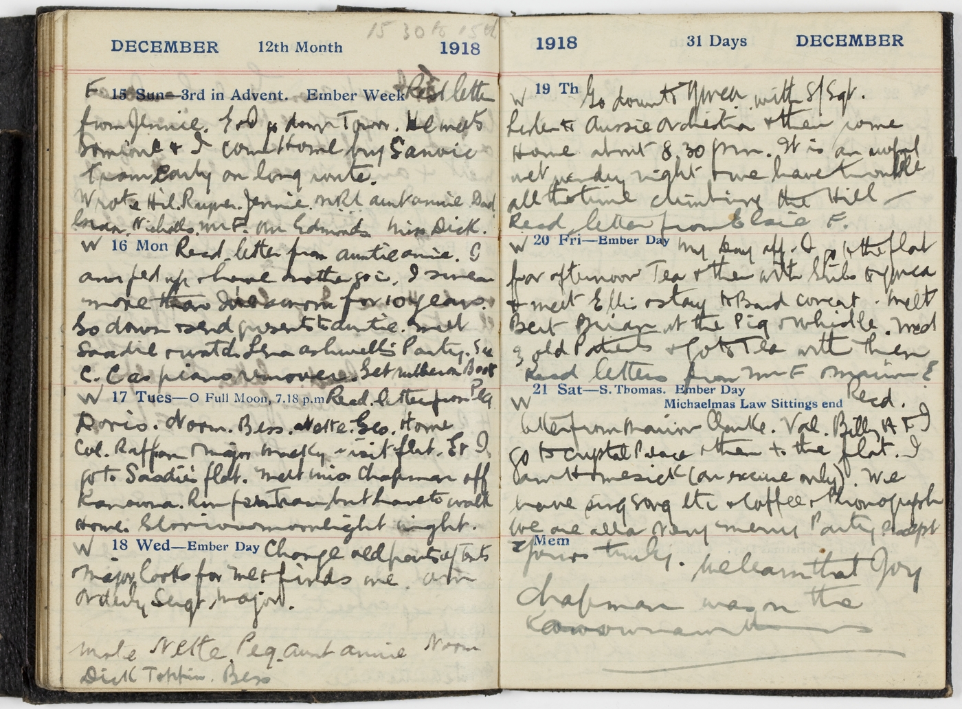 Recd letter from Aunt Annie. I am fed up & have another [indecipherable]. I swear more than I've sworn for 10 years. Go down & send presents to Auntie. Meet [Sadie?] & watch [Lena Ashwell's?] Party. See C. C as piano remover. Get [indecipherable] on Best