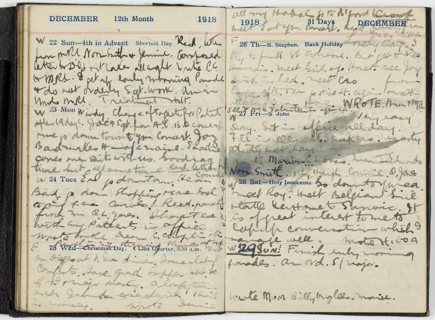 E & I go down town. Hear Band go down Shopping & come back to sing Xmas Carols. Recd parcel from Mr C.L. Jones. I have Tea with my patients in office. Wrote MRL [indecipherable] C. Chaplin & others. [indecipherable] ; throwing knives at me.