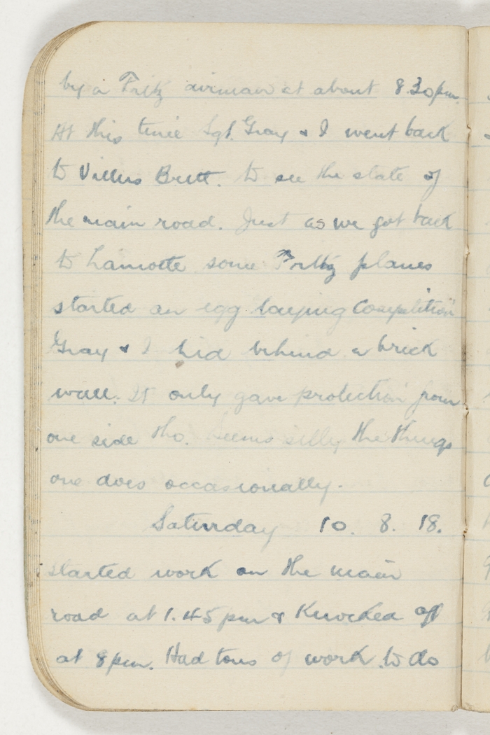 Fritz came over last night & gave us tons of his eggs. They were very close too. Reported to B.O.R. at 9a.m for the school. The valise & packs went to the station in a limber & the 2 sergeants & I went to Vequemont by lorries. Walked about till the train came in & met tons of officers I knew. Bill Stewart, Tommy Sard, Garnsey, Jenkins & a bit more. Left Vequemont at 2pm & went to Vignacourt. This was small guage. Had to walk from Vignacourt to Pernois (about 4 or 5 Kilo.) Had a cup of tea here & then caught a train