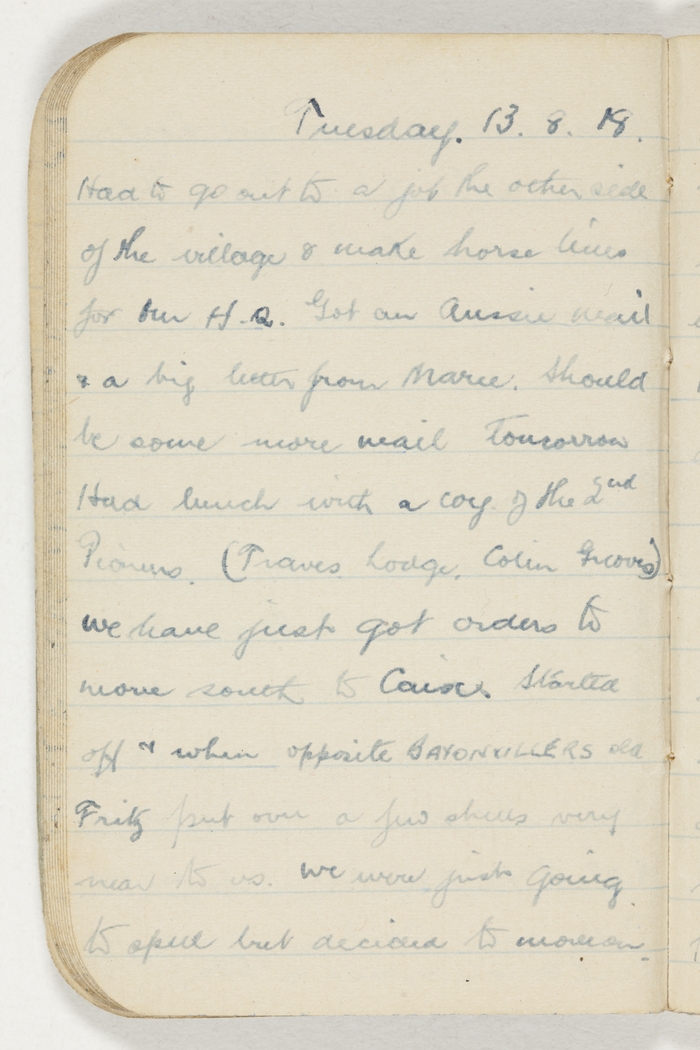Went to MER & to EU. Mer on the sea much like le Treport & is very nice. EU is a big place & very clean. Had a look at the big church there & just after coming out from it Dinney Shearer came along on a charabanc, so went back to Le Treport with him. He & I went up to the 2nd General Hospital & had a talk to two or three wounded Aussie officers there. Rained all day & spoilt a good night away. Left there about 7.30 & missed rain all the way. Gee we were lucky tho.