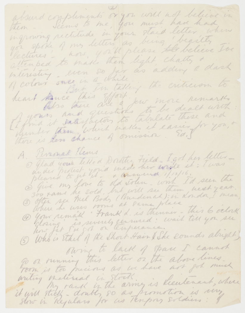 Owing to lack of space I cannot go on running this letter or the above lines, room is too precious as we have not got much writing material in stock.