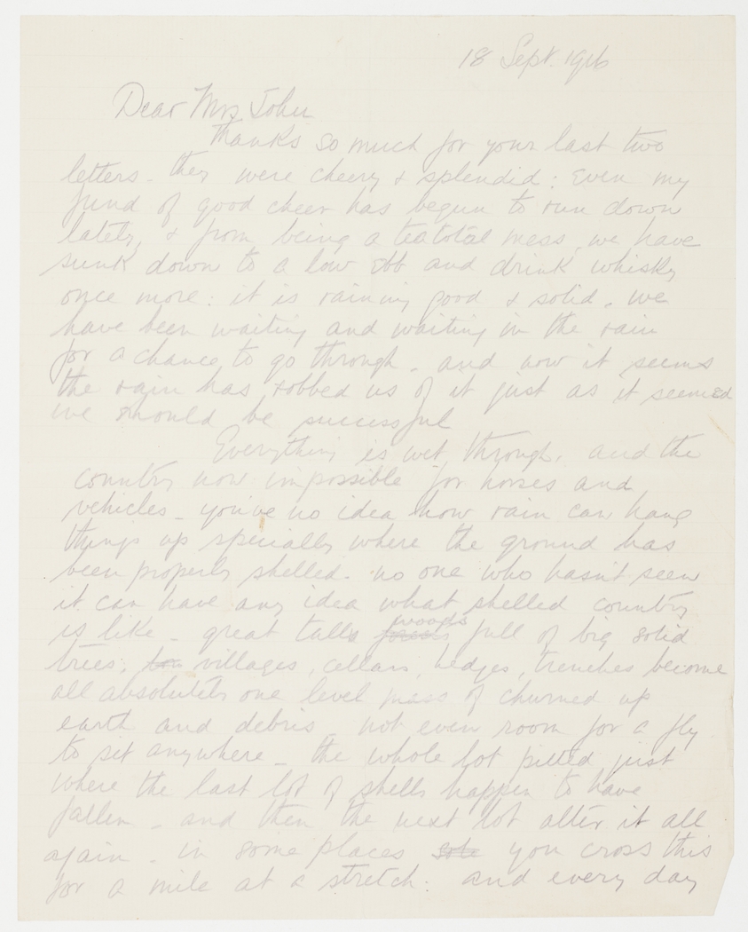 Everything is wet through, and the country now impossible for horses and vehicles, you've no idea how rain can hang things up specially where the ground has been properly shelled, no one who hasn't seen it can have any idea what shelled country is like, great tall woods full of big solid trees, villages, cellars, hedges, trenches become all absolutely one level mass of churned up earth and debris, not even room for a fly to sit anywhere, the whole lot pitted just where the last lot of shells happen to have fallen, and then the next lot alter it all again, in some places you cross this for a mile at a stretch: and every day