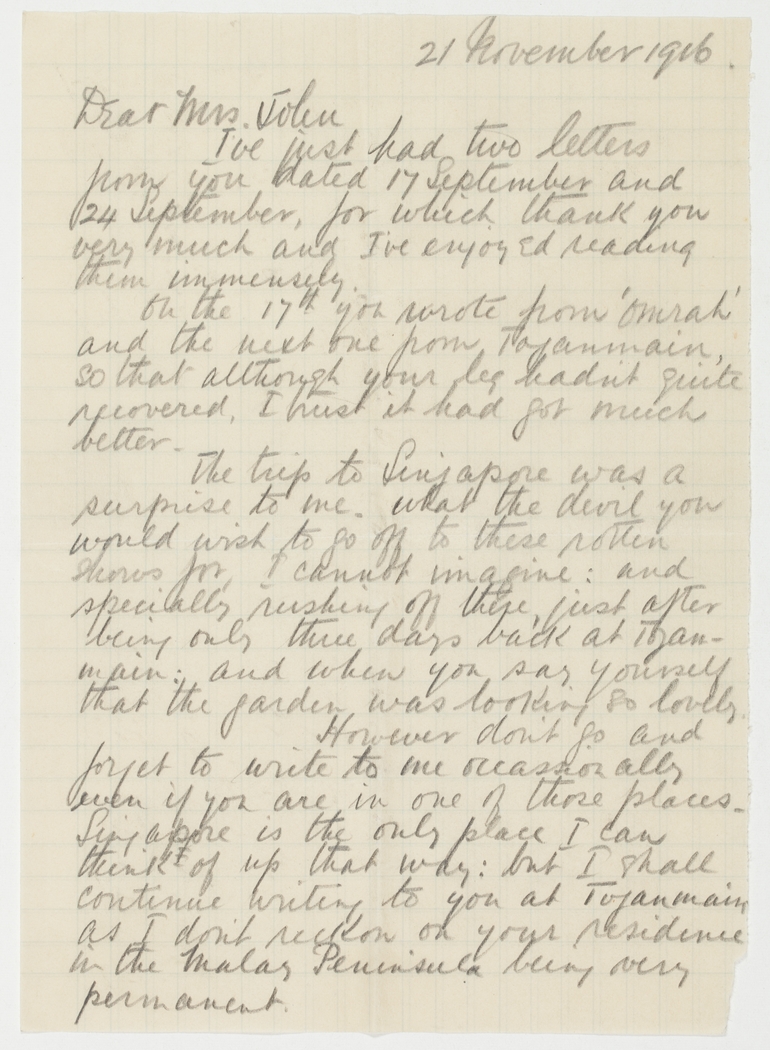 The trip to Singapore was a surprise to me. What the devil you would wish to go off to these rotten shores for, I cannot imagine: and specially rushing off there, just after being only three days back at Toganmain: and when you say yourself that the garden was looking so lovely.