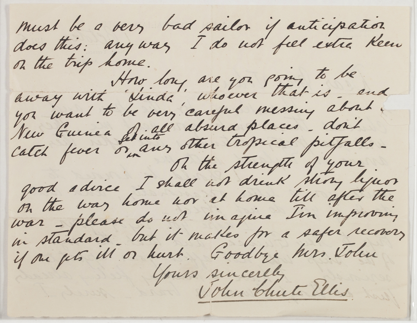 On the strength of your good advice I shall not drink strong liquor on the way home nor at home till after the war – please do not imagine I'm improving in standard, but it makes for a safer recovery if one gets ill or hurt. Goodbye Mrs. John.