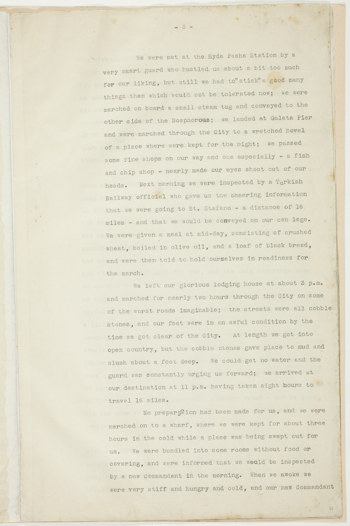 3. We were met at the Hyda Pasha Station by a very smart guard who hustled us about a bit too much for our liking, but still we had to "stick" a good many things then which would not be tolerated now; we were marched on board a small steam tug and conveyed to the other side of the Bosphorous; we landed at Galata Pier and were marched through the City to a wretched hovel of a place where [we] were kept for the night; we passed some fine shops on our way and one especially- a fish and chip shop- nearly made our eyes shoot out of our heads. Next morning we were inspected by a Turkish Railway official who gave us the cheering information that we were going to St. Stafano- a distance of 16 miles- and that we would be conveyed on our own legs. We were given a meal at mid-day, consisting of crushed wheat, boiled in olive oil, and a loaf of black bread, and were then told to hold ourselves in readiness for the march.