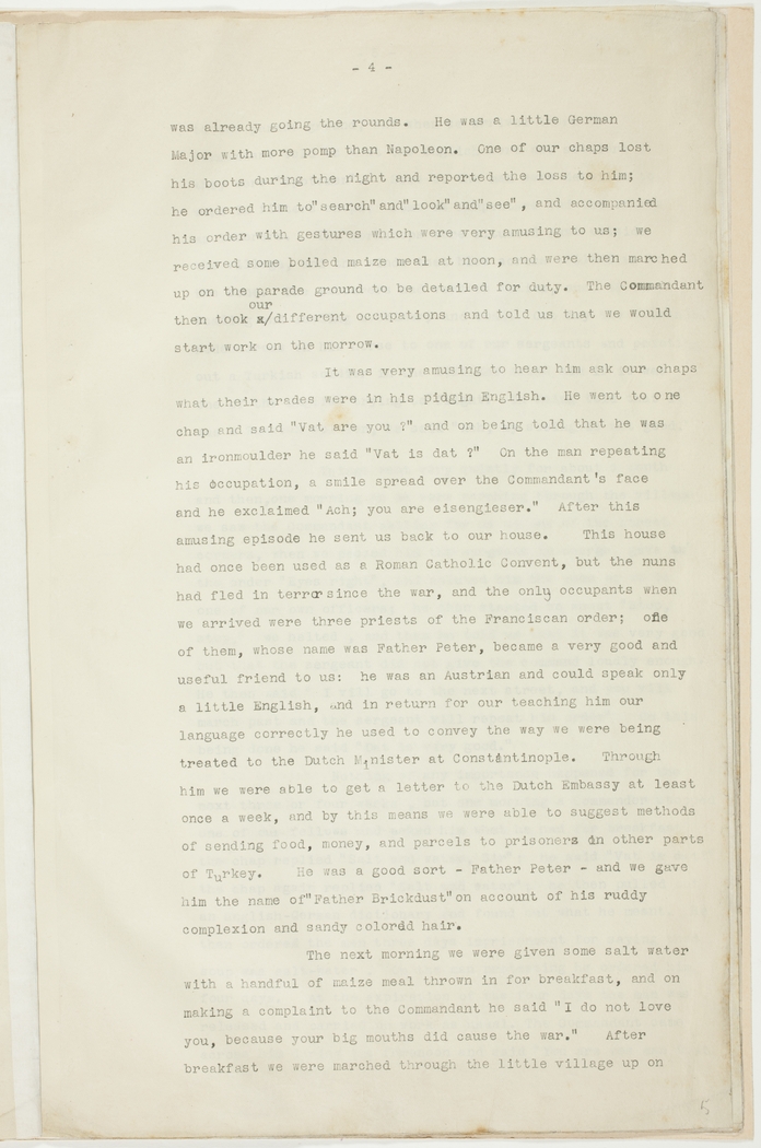 It was very amusing to hear him ask our chaps what their trades were in his pidgin English. He went to one chap and said "Vat are you?" and on being told that he was an ironmoulder he said "Vat is dat?" On the man repeating his occupation, a smile spread over the Commandant's face and he exclaimed "Ach; you are eisengieser." After this amusing episode he sent us back to our house. This house had once been used as a Roman Catholic Convent, but the nuns had fled in terror since the war, and the only occupants when we arrived were three priests of the Franciscan order; one of them, whose name was Father Peter, became a very good and useful friend to us: he was an Austrian and could speak only a little English, and in return for our teaching him our language correctly he used to convey the way we were being treated to the Dutch Minister at Constantinople. Through him we were able to get a letter to the Dutch Embassy at least once a week, and by this means we were able to suggest methods of sending food, money, and parcels to prisoners in other parts of Turkey. He was a good sort-Father Peter- and we gave him the name of "Father Brickdust" on account of his ruddy complexion and sandy colored hair.
