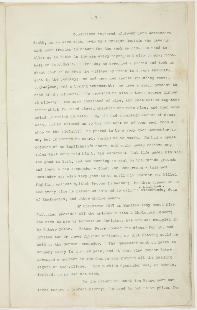 7. Conditions improved after our late Commanders death, as we were taken over by a Turkish Captain who gave us much more freedom in return for the work we did. He used to allow us to bathe in the sea every night, and also to play football on Saturday's. One day he arranged a picnic and took us about four miles from the village by train to a very beautiful spot in the country; he had arranged sports including races, tugs-o-war, and a boxing tournament; he gave a small present to each of the winners. He provided us with a three course dinner at mid-day; the meal consisted of rice, and meat boiled together after which followed stewed cherries and more rice, and then some salad to finish with. We all had a certain amount of money each, and he allowed us to buy two bottles of beer each from a shop in the vicinity; he proved to be a very good Commander to us, but in return he nearly worked us to death. He had a great opinion of an Englishman's honor, and would never believe any tales that were told him by the sentries: but life under him was too good to last, and one morning we went on the parade grounds and found a new commander-Count Von Bennermann- this new Commander was also very good to us until his brother was killed fighting against British Troops in France; he then turned on us and every time he passed us he used to call us swinehunds "schweinhunds", dogs of Englanders, and other choice names.