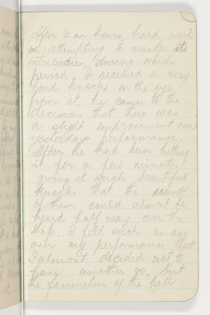 After ½ an hours hard work in attempting to master its intricacies, during which period I received a very hard knock on the eye from it, he came to the decision that there was a slight improvement over yesterdays performance. After he had been hitting it for a few minutes, giving it such beautiful knocks that the sound of them could almost be heard half way over the ship, I felt such an ass over my performance that I almost decided not to have another go, but the fascination of the ball