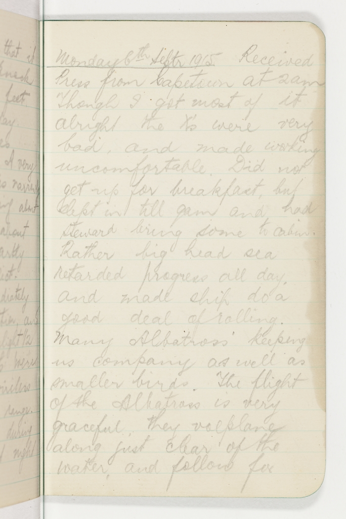 Monday 6th Septr 1915. Received Press from Capetown at 2am. Though I got most of it alright the X's were very bad and made working uncomfortable. Did not get up for breakfast, but slept in till 9am and had Steward bring some to cabin. Rather big head sea retarded progress all day and made ship do a good deal of rolling. Many Albatross' keeping us company as well as smaller birds. The flight of the Albatross is very graceful, they volplane along just clear of the water, and follow for