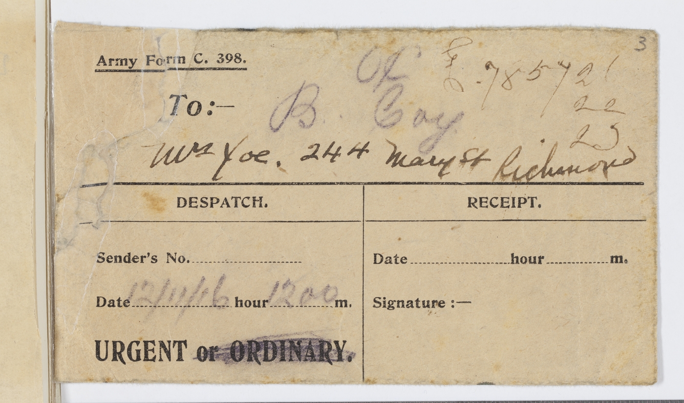 [Army Form C.398.]O/C B Cay Mrs Yoe, 244 Mary St Richmond[Despatch Date] 12/11/16 12.00[Urgent]