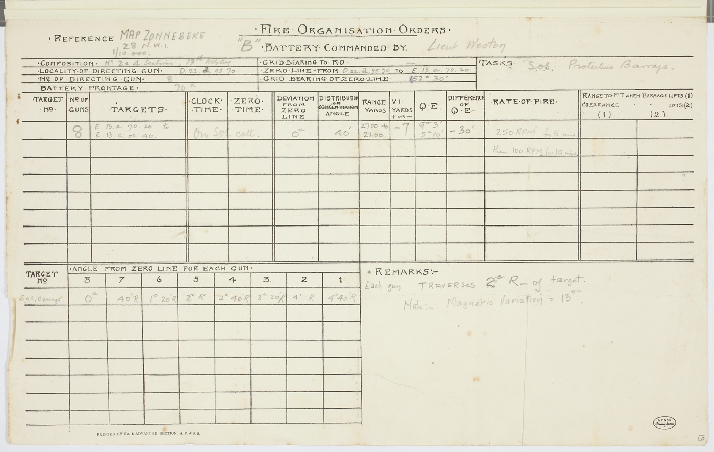 "Fire Organisation Orders" "B" Battery Commanded by Lieut Weston