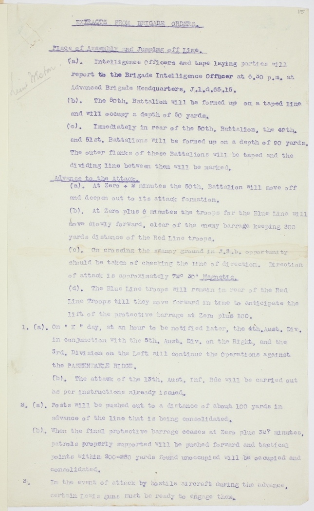 3. In the event of attack by hostile aircraft during the advance, certain Lewis guns must be ready to engage them.