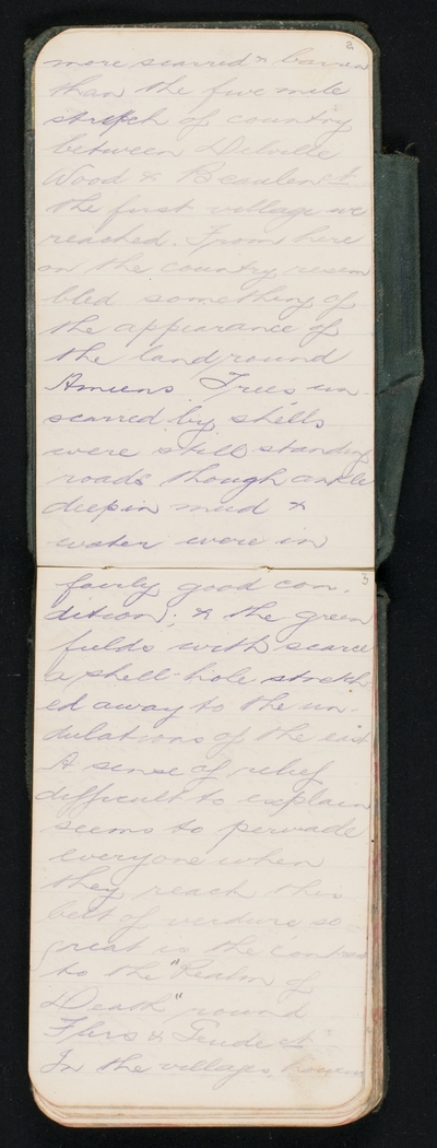 more scarred & barren than the five mile stretch of country between Delville Wood & Beaulenct the first village we reached. From here on the country resembled something of the appearance of the land round Amiens. Trees unscarred by shells were still standing roads though ankle deep in mud & water were in fairly good condition & the green fields with scarce a shell-hole stretched away to the undulations of the east. A sense of relief difficult to explain seems to pervade everyone when they reach this belt of verdure so great is the contrast to the "Realm of Death" round Flers & Geudect. In the villages however